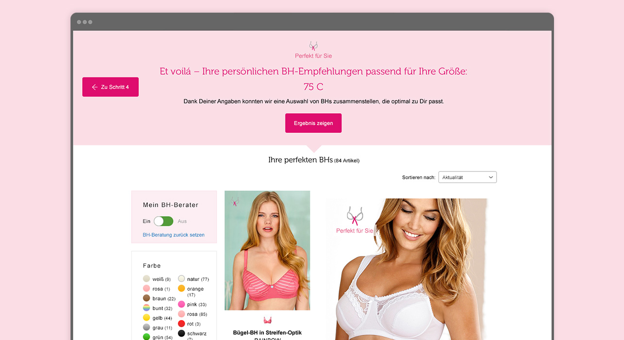 Using a fast, very easy and intuitive process, customers enter their personal data and individual preferences and, in just four steps, receive personalized bra recommendations.